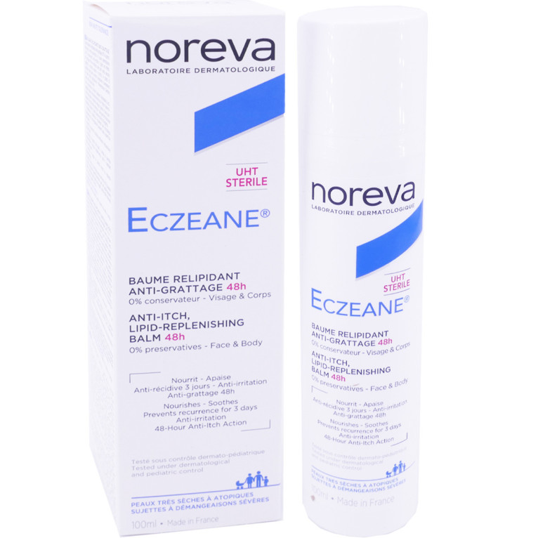 Les laboratoires NOREVA développent des soins dermo-cosmétiques qui allient performance, tolérance et innovation galénique, adaptés à tous les types de peau et offrant une réponse ciblée à chaque besoin cutané. La gamme ECZEANE est spécialement conçue pour apporter des solutions haute tolérance aux peaux sensibles de toute la famille en proposant des soins sans conservateurs destinés à apaiser et réparer les peaux très sèches et/ou atopiques avec eczéma et démangeaisons sévères. ECZEANE Baume Relipidant Anti-grattage des laboratoires NOREVA, à la texture riche qui fond sur la peau, est un soin spécialement formulé pour apaiser les irritations cutanées, restructurer l’épiderme, compenser le manque en filagrine qui est à l’origine des peaux atopiques à sècheresse sévère, rééquilibrer le microbiome cutané afin de limiter les grattages et hydrater les peaux atopiques avec eczéma de toute la famille. De dernière génération, le baume à l’action anti-grattage 48h et anti récidive 3 jours, apaisera pour longtemps les peaux irritées et espacera la sècheresse sévère. La peau intensément apaisée, retrouve souplesse, douceur et confort dès l’application et pendant 48 heures. Testé sous contrôle dermatologique et pédiatrique. sur peaux sèches et atopiques sujettes aux démangeaisons. Sans parfum