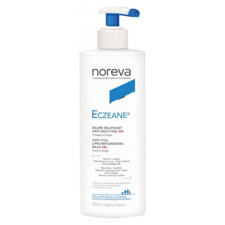 ECZEANE Baume Relipidant Anti-grattage discount des laboratoires NOREVA le soin très haute-tolérance conçu par des dermatologues dans votre parapharmacie en ligne à prix discount, pour restructurer, apaiser, relipider et hydrater les peaux très sèches et/ou à tendance atopique avec démangeaisons sévères, nourrissons, enfants, adultes. Visage et corps