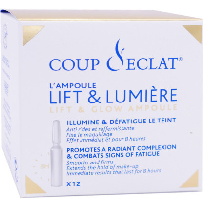 La gamme COUP D’ECLAT du laboratoire Asepta est composée de produits cosmétiques destinés à la femme pour préserver la jeunesse de la peau et lui redonner de l’éclat lors de visage terne ou sensible. Les ampoules Lift & Lumière composés d’un complexe Tenseur végétal (Extraits d'Acmella Oleracea, Jus de Sorgho, Amandes, Algues Rouges), de sel d’acide hyaluronique et de provitamine B5, protège la peau de l’apparition des signes de l’âge (rides et ridules), lifte la peau pour décrisper les muscles de la peau afin de lisser les rides et ridules et la défroisser, redonne du tonus et l’éclat à la peau, et hydrate intensément. Dès l’application et pendant 8 heures, la peau est hydratée et douce, les rides et signes de fatigue sont estompés, le teint est éclatant.