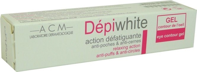 La gamme Dépiwhite du laboratoire ACM est composée de produits dermatologiques destinés à réduire les taches cutanées sur la peau. Le Gel Depiwhite Action Défatiguante Contour de l’œil agit sur la micro-circulation sanguine et la production de mélanine pour la réduire et ainsi estomper l'apparition des cernes et des poches grâce à l'association de la chrysine et du N-hydroxysuccinimide avec les actifs végétaux. L'Hespéridine methyl chalcone et 2 peptides vont améliorer le drainage lymphatique et agir sur l'action veinotonique pour diminuer la couleur des poche, et renforcer la structure cutanée.