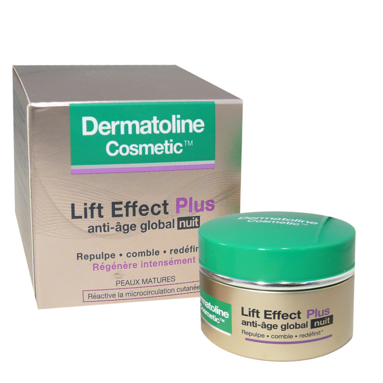 La marque DERMATOLINE COSMETIC est composée de produits anti-âge testés cliniquement aux actifs naturels pour hommes et femmes pour retrouver un visage jeune effacé de tous signes de l'âge. La Crème anti-âge global Nuit Lift Effect Plus agit pendant la phase nocturne, sur la jeunesse du visage grâce au complexe NightRedensePlus-Complex. Ce complexe contient du Nicoment qui va stimuler la microcirculation cutanée afin de drainer les liquides en excès et réoxygéner les cellules cutanées ; un système Régénérant pour redonner à la peau élasticité et densité. Le peptide de jeunesse régénérant va réparer et protéger l’ADN et les cellules cutanées du vieillissement. Sa texture riche et onctueuse non grasse laisse dès l’application une grande douceur. Nuit après nuit, la peau est lumineuse et rajeunit rides et ridules sont estompées pour retrouver un visage éclatant et un ovale redessiné.