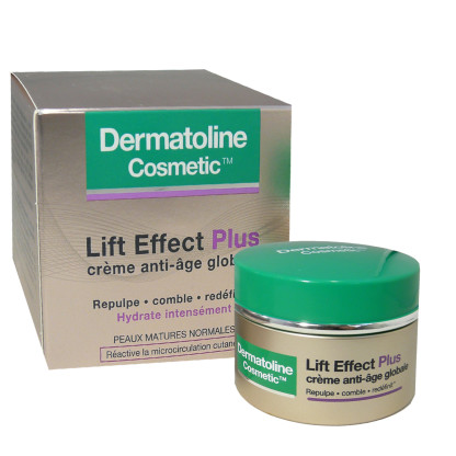 La marque DERMATOLINE COSMETIC est composée de produits anti-âge testés cliniquement aux actifs naturels pour hommes et femmes pour retrouver un visage jeune effacé de tous signes de l'âge. La Crème anti-âge global Peaux normales Lift Effect Plus agit sur la jeunesse du visage grâce au complexe DayRedensePlus-Complex. Ce complexe contient du Menthyl Lactate va stimuler la microcirculation cutanée afin de drainer les liquides en excès et réoxygéner les cellules cutanées, et redéfinir les volumes du visage afin de combler et d’effacer les rides et ridules ; un système Biocellprotection pour protéger l’épiderme du stress oxydatif et du vieillissement prématuré tout en régénérant la peau, et d’un filtre SPF10 qui protègera la peau du soleil et luttera contre l’apparition des taches brunes. Le peptide de jeunesse régénérant associé à l’huile de riz hydratant, vont réparer et protéger l’ADN et les cellules cutanées du vieillissement tout en hydratant en profondeur la peau. Jour après jour, la peau est lumineuse et rajeunit rides et ridules sont estompées pour retrouver un visage éclatant, et lisse
