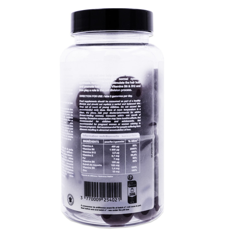 Complément alimetaire à base de de vitamines, de biotine, de zinc, de fer ainsi que d'extraits de roquette.