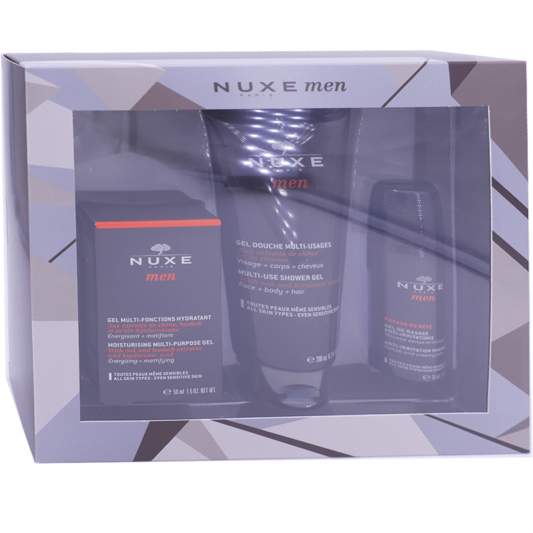 Le Coffret « Nuxe Men » de NUXE, un coffret à offrir ou à se faire offrir, pour des fragrances masculines NUXE composé de Gel de rasage anti-irritations (35ml) ; Gel multi-fonctions hydratant (50ml) ; Gel douche multi-usage (200ml). Tous types de peaux pour Homme