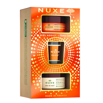 Le Coffret « Miel Addict » de NUXE, un coffret à offrir ou à se faire offrir, pour des fragrances mythiques réconfortantes et gourmandes des soins Rêve de Miel composé de Rêve de miel Gommage Gourmand Nourrissant Corps (175ml) et Rêve de Miel Baume-huile Corps Fondant au Miel (200ml) + Rêve de Miel Bougie d’intérieur (70g). Dans votre parapharmacie en ligne à prix discount. Tous types de peaux Corps