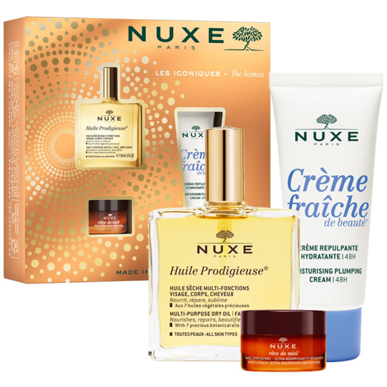 Le Coffret « Les Iconiques » de NUXE, un coffret à offrir ou à se faire offrir, pour des fragrances mythiques du parfum NUXE composé de l’Huile Prodigieuse (50ml), la Crème fraîche de Beauté (30ml), et du Baume Lèvres au Miel Rêve de miel (15g). Tous types de peaux