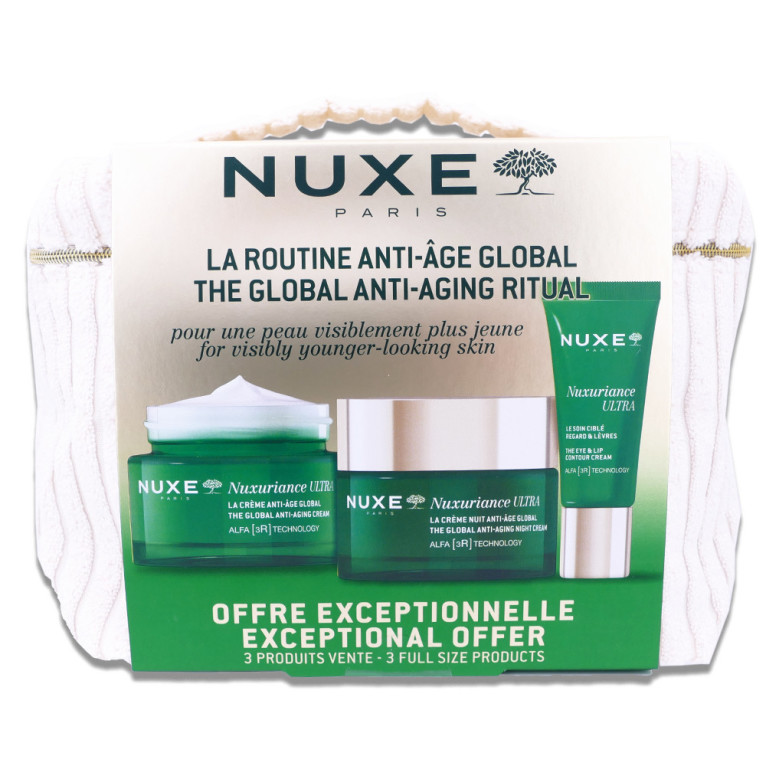 NUXE ROUTINE ANTI AGE GLOBAL TROUSSE + 3 SOINS est en vente en ligne sur le site de votre parapharmacie à prix discount, offrant une solution complète pour le soin anti-âge de la peau mature.