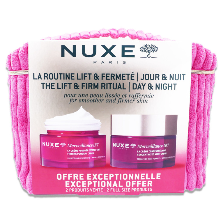 Cette trousse de la marque NUXE comprend une crème poudrée effet liftant et une crème concentrée de nuit, chacune formulée pour apporter un effet cosmétique raffermissant et lissant. La crème poudrée effet liftant, avec sa texture légère, est conçue pour donner à la peau un aspect plus ferme et plus lisse tout au long de la journée. La crème concentrée de nuit, riche et onctueuse, aide à nourrir intensément la peau pendant le sommeil, favorisant un teint reposé et éclatant au réveil. Les deux produits contiennent des ingrédients actifs reconnus pour leur efficacité cosmétique dans l'amélioration de l'apparence de la peau.
