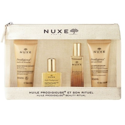 La Trousse « Huile Prodigieuse et son Rituel » discount de NUXE, 4 produits petits formats à offrir ou à se faire offrir dans votre parapharmacie en ligne à prix discount, pour des fragrances mythiques du parfum NUXE ! Le Parfum Prodigieux (15ml) ; Lait Parfumé Prodigieux (30ml) ; Huile de douche (30ml) ; Huile Prodigieuse (10ml)