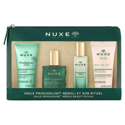 La Trousse « Huile Prodigieuse Néroli et son Rituel » discount de NUXE, 4 produits à offrir ou à se faire offrir, pour des fragrances apaisantes aux notes de néroli ! Douche Relaxante Parfumée Prodigieux Néroli (30ml) ; Huile Prodigieuse Néroli (30ml) ; Prodigieux Néroli le Parfum (15ml) ; Gommage Granité Ressourçant Rêve de Thé (30ml), dans votre parapharmacie en ligne à prix discount.