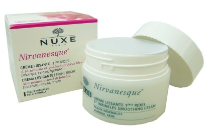 Nuxe, contraction de Nature et Luxe, développe depuis 25 ans des soins cosmétiques raffinés, élaborés avec des actifs végétaux précieux, sans huile minérale ni matière animale hormis les produits de la ruche, pour offrir des produits associant avec le plus bel équilibre : nature, performance et sensualité. La gamme Nirvanesque propose des soins anti-âge composés d’extraits de pivoine et des graines de lotus bleu pour lisser les premières rides, défatiguer les traits et relaxer la peau. La crème Nirvanesque de Nuxe, formulée avec 87% d’ingrédients d’origine naturelle dont des extraits de racine de guimauve, des graines de coquelicot et de l’huile de rosier muscat, est spécialement conçue pour lisser visiblement les rides d’expression, hydrater et relaxer intensément la peau. Les traits du visage sont défatigués, la peau est relaxée, elle s’enveloppe d’un délicat parfum de mimosa, le visage est détendu. Sans paraben, non comédogène.