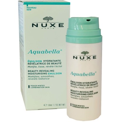 Nuxe, contraction de Nature et Luxe, développe depuis 25 ans des soins cosmétiques raffinés, élaborés avec des actifs végétaux précieux, sans huile minérale ni matière animale hormis les produits de la ruche, pour offrir des produits associant avec le plus bel équilibre : nature, performance et sensualité. La gamme Aquabella propose des soins ultra-doux, formulés avec un extrait de nénuphar blanc et un complexe Blur Vététal breveté NUXE pour améliorer la qualité de la peau et hydrater intensément les peaux mixtes. L’Emulsion Hydratante Révélatrice de beauté Aquabella à la formule ultra-douce, composée du Complexe Blur Végétal qui contient Avoine, Capucine, Lentille verte lisse et affine le grain de peau et matifie pour un visage unifié et éclatant. Le nymphéa blanc hautement hydratant et la poudre de silice matifiante vont hydrater en profondeur la peau et ainsi lutter contre la sècheresse cutanée tout en éliminant les zones de brillance du visage. Sa texture légère fond sur la peau pour laisser une sensation « peau nue ». La peau lisse retrouve de la douceur avec un léger parfum de fleurs et notes marines pour une sensation de fraicheur longue durée. Le teint est clarifié. Sans paraben, non comédogène