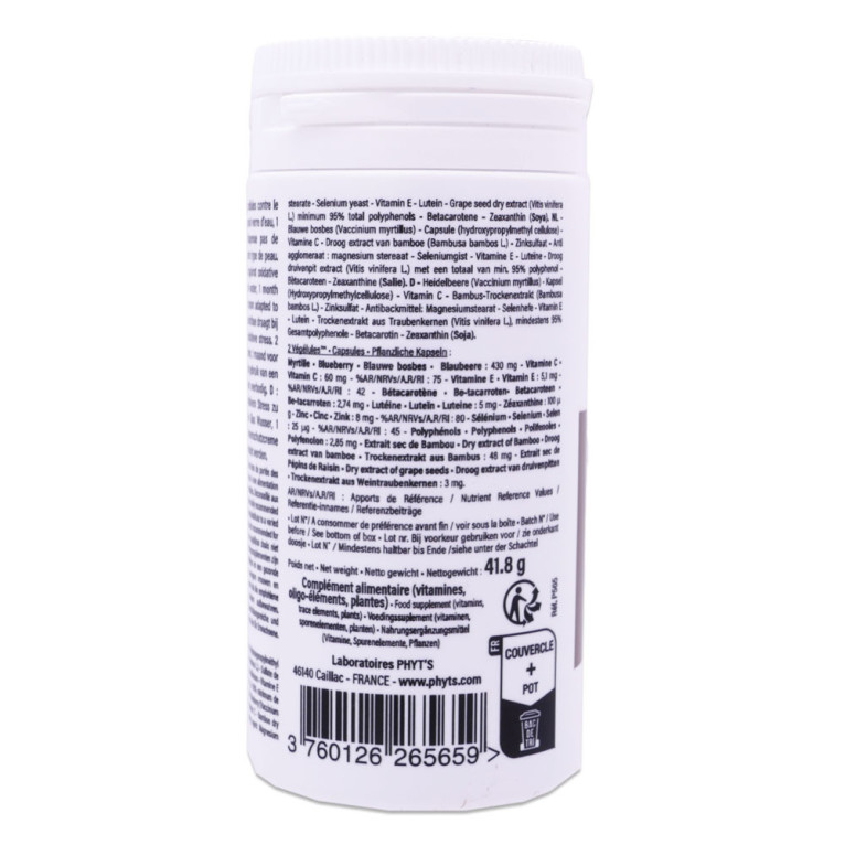 Myrtille (Vaccinium myrtillus L.) – Gélule (Hydroxypropylméthyl cellulose) – Vitamine C – Extrait sec de Bambou (Bambusa bambos L.) – Sulfate de Zinc – Antiagglomérant : Stéarate de magnésium – Levure de sélénium – Vitamine E – Lutéine – Extrait sec de pépins de Raisin (Vitis vinifera L.) à 95% minimum de polyphénols totaux – Bétacarotène – Zéaxanthine (Soja)