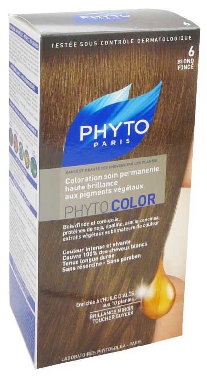 PHYTOCOLOR couleur soin de PHYTO, la puissance végétale dans un soin haute brillance pour des cheveux à la couleur sublimée longue tenue. Nuance Blond foncé 6.