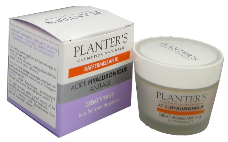 PLANTER’S propose un large choix de produits de soins cosmétiques naturels et haut de gamme destinés à une clientèle exigeante et éco-responsable. La gamme ACIDE HYALURONIQUE offre des soins hautement concentrés en acide hyaluronique pour préserver l’équilibre hydrique de la peau et garantir le maintien de son tonus et son élasticité. L’acide hyaluronique est l’un des composants essentiels du tissu cutané. Il apporte résistance et élasticité à la peau, et sa diminution provoque un affaissement de l’épiderme et l’apparition de rides et d’imperfections. L’acide hyaluronique contenu dans cette gamme de soins va aider la peau à lutter efficacement contre les signes du temps. La crème visage RAFFERMISSANTE est le soin quotidien indispensable pour apporter tonus, souplesse et éclat à la peau. Sa formule est enrichie d’un filtre UVA-UVB et de vitamine E protectrice pour lutter efficacement contre les radicaux libres induits par le soleil, et d’actifs anti-âge aux propriétés nourrissantes, raffermissantes et restructurantes. Le visage gagne visiblement en jeunesse, jour après jour. Sans paraben, soumis à des tests sur le nickel, soumis à des tests de tolérance et d’efficacité. Non testé sur les animaux.