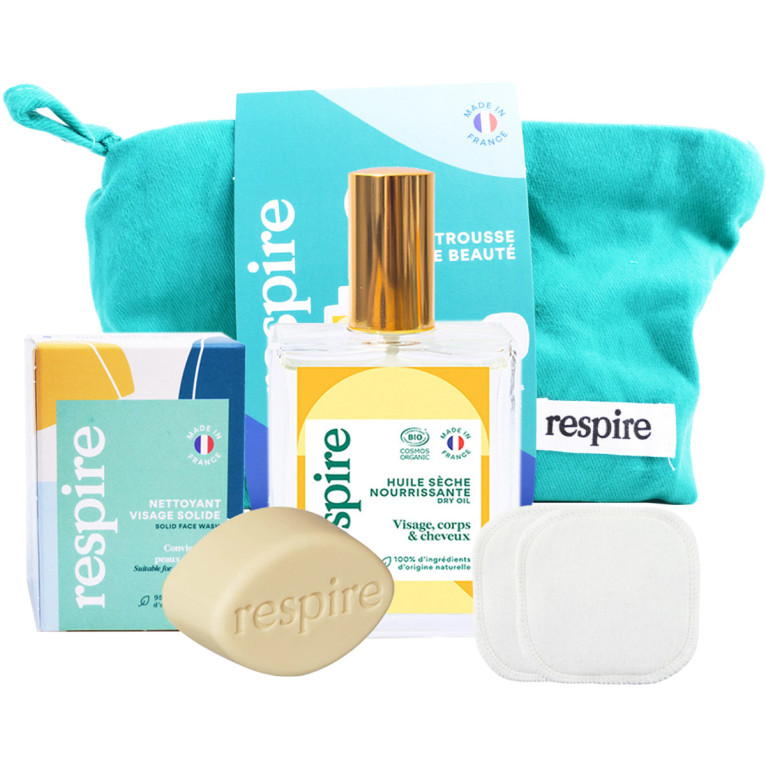 La Trousse Routine Beauté discount de Respire, 2 soins à la formule naturelle et Vegan, pour nettoyer et nourrir la peau, dans votre parapharmacie en ligne à prix discount. Contient : 1 Huile Sèche Nourrissante 50ml, 1 Nettoyant Visage solide 15g, 2 cotons réutilisables