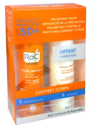 Le Coffret solaire de ROC est composé d’un soin protecteur solaire (Soleil protect Lait hydratant SPF50+ 200ml), un soin après-soleil (Lait réparateur rafraîchissant après-soleil 200ml). Tous types de peaux même sensibles du visage et du corps