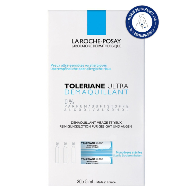 Depuis plus de 30 ans, le laboratoire LA ROCHE POSAY développe des produits dermo-cosmétiques élaborés avec de l’eau thermale de LA ROCHE POSAY riche en Sélénium aux propriétés anti-radicalaires, pour répondre à tous les besoins des peaux même les plus fragiles. La gamme TOLERIANE propose des soins haute-tolérance, sans parfum, sans conservateur ni alcool, formulés avec un minimum de composants pour limiter les risques d’allergie, afin d’offrir la plus grande douceur aux peaux intolérantes. TOLERIANE démaquillant yeux, présenté en monodoses stériles pour un maximum de sécurité, est spécialement formulé pour assurer un démaquillage efficace et instantané sans irritations des yeux sensibles et/ou porteurs de lentilles. Sa composition contient du Hyaluronate de sodium, traditionnellement utilisé en chirurgie ophtalmique.