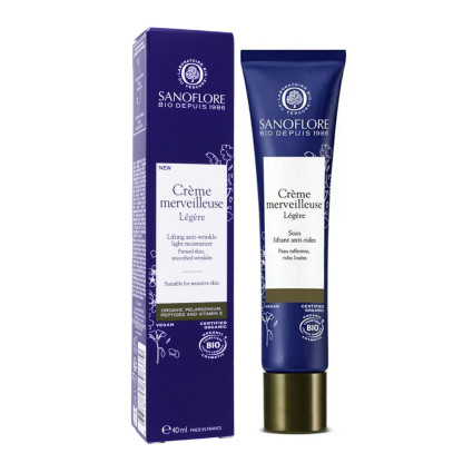 SANOFLORE extrait toutes les richesses du végétal et les incorpore dans une gamme de soins de beauté élaborés à base d’eaux florales et d’huiles essentielles, pour offrir le meilleur de la nature aux peaux les plus sensibles. Les soins de la gamme Merveilleuse sont élaborés à base d’huiles essentielles de Pelargonium Bio et de Melissa officinalis Bio, deux actifs naturels aux pouvoirs anti-âge incomparables, aussi puissants que le rétinol et la vitamine C. La crème merveilleuse, à la texture enrichie en agents émollients pour plus de douceur, délicatement parfumée, est spécialement conçue pour lisser et raffermir la peau. Sans paraben, sans parfum de synthèse, sans huile minérale.