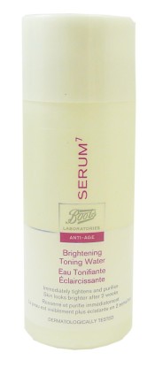 Afin de combattre les premiers signes du vieillissement cutané : rides et ridules, Les laboratoires BOOTS ont conçu une gamme complète de soins anti-âge : SERUM7. L’eau tonifiante composé d’un complexe d’antioxydants (mûre, ginseng, vitamine C), d’acides de fruits (extraits de myrtille, citron vert, fleur d’oranger) et d’extrait de sucre d’érable, va éliminer les résidus du lait démaquillant et les cellules mortes de l’épiderme, protéger la peau des agressions quotidiennes, resserrer les pores pour lisser la peau, la purifier et l’éclaircir. Après le soin, la peau est douce et tonifiée. En 2 semaines, elle retrouve tout son éclat.
