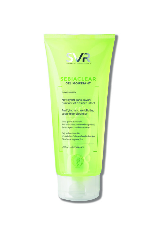 La gamme Sébiaclear de SVR est composée de soins anti-imperfections purifiants révolutionnaires pour éliminer les boutons, points noirs…, des peaux grasses et sensibles, et redonner beauté et douceur. Le gel moussant Sébiaclear à base de Gluconolactone du complexe Mat SR, de Niacinamide et d’une base lavante douce, élimine toutes les impuretés et le sébum en trop grande quantité en désincrustant et resserrant les pores de l’épiderme, lutte contre la prolifération des bactéries et de l’apparition de nouvelles imperfections, assainit, et purifie la peau. Sa texture gel se transforme en mousse onctueuse au contact de la peau mouillée pour faire de ce soin un vrai moment de plaisir. Après le soin, la peau est nette, matifiée, et retrouve tout son confort et sa fraîcheur.