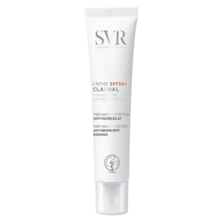 Crème SPF50+ Clairial discount de SVR, un soin antitaches et protecteur solaire dans votre parapharmacie en ligne à prix discount, qui prévient les taches brunes (soleil, vieillissement cutané, grossesse, imperfections, teint irrégulier) et protège très efficacement la peau du soleil de tous les peaux sensibles du visage, des mains et du décolleté.