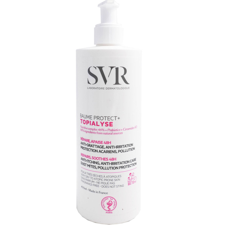 TOPIALYSE Baume PROTECT+ discount de SVR, le soin quotidien formulé pour rétablir confort, souplesse et douceur aux peaux sensibles sèches à très sèches à tendance atopique, dans votre parapharmacie en ligne à prix discount. Dès la naissance, pour toute la famille. Corps et visage.