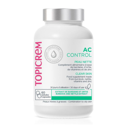 TOPICREM AC CONTROL PEAU NETTE 60 GELULES en vente en ligne sur le site de votre parapharmacie à prix discount est un complément alimentaire qui aide à maintenir une peau nette et saine.