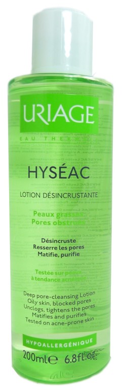 URIAGE a conçu un programme de soins spécifiques destinés à offrir des solutions ciblées aux problèmes des peaux grasses sujettes aux imperfections : HYSEAC. La lotion désincrustante enrichie à l’eau thermale d’Uriage a spécialement été formulée pour désobstruer les pores, les resserrer et affiner le grain de peau grâce à l’efficacité micro-exfoliante d’un complexe d’AHA/BHA. Formule hypoallergénique au pH physiologique, sans parfum, non comédogène.