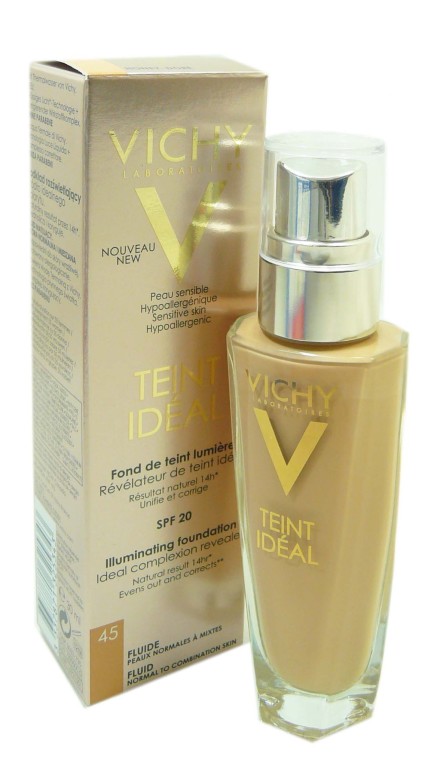 Vichy a conçu une nouvelle gamme de soins pour le teint, gorgés d’actifs aux pouvoirs perfecteurs et illuminateurs pour offrir naturellement une peau radieuse et un teint rayonnant : TEINT IDEAL. Les fonds de teint fluide à la texture fraîche et légère adaptée aux peaux normales à mixtes, sont spécialement formulés pour corriger les imperfections et unifier le teint de façon très naturelle pendant 14 heures. Ils associent un complexe correcteur perfecteur de peau à des vitamines C et E aux propriétés antioxydantes et un agent vitalisant. La nouvelle technologie lumière de ces fonds de teint recouvre chaque millimètre de l’épiderme d’un véritable voile de lumière pour sublimer la peau et illuminer le teint. Formule hypoallergénique enrichie à l’eau thermale de Vichy, sans paraben.