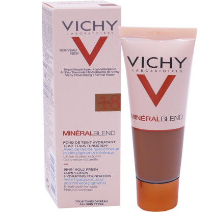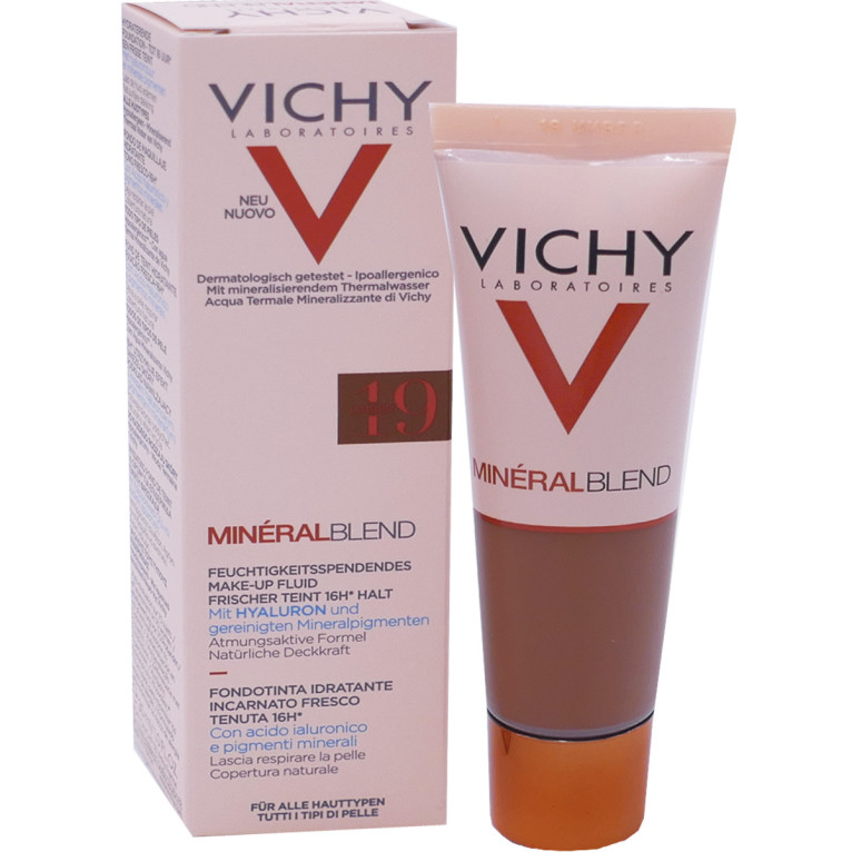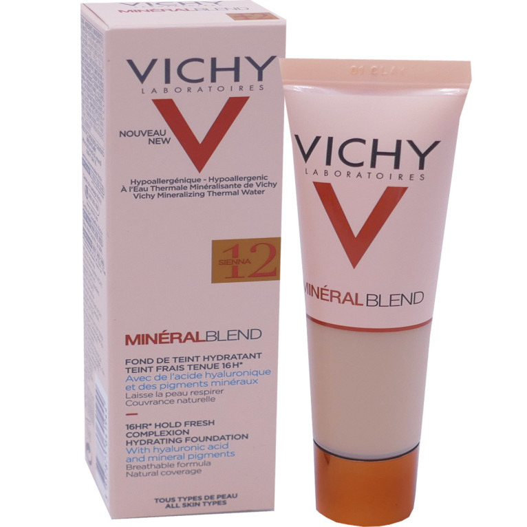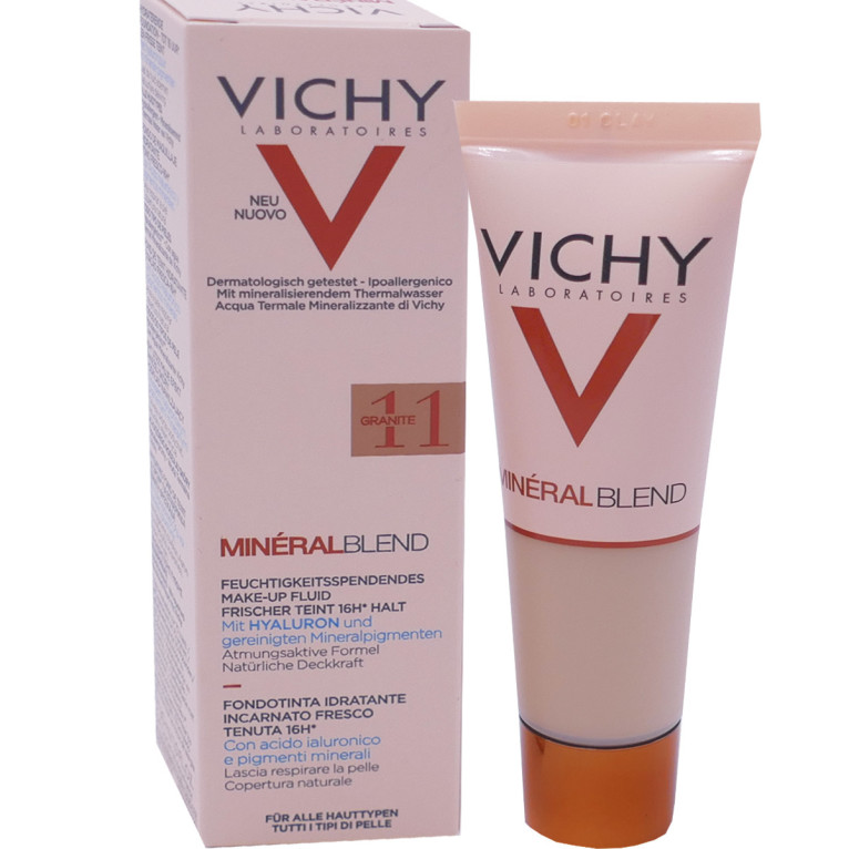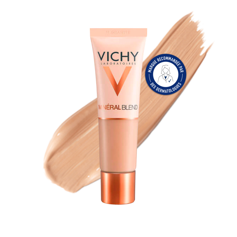 Vichy a conçu une nouvelle gamme de soins minéraux pour le teint au pouvoir hautement correctif et assurant une tolérance optimale : MINERALBLEND. Les fonds de teint hydratants sont spécialement formulés pour hydrater la peau et procurer un teint frais pendant 16 heures. Ils associent une haute concentration en pigments minéraux assurant une correction optimale pendant 16 heures, à de l’acide hyaluronique d’origine naturelle pour hydrater intensément la peau et la repulper. Le fond de teint riche en Eau thermale de Vichy reminéralisante renforce la barrière de la peau et la régénère. Sa texture légère fond sur la peau sans laisser d’effet masque pour une peau qui respire tout au long de la journée. Instantanément et pendant 16 heures le teint est unifié et lumineux, la peau retrouve souplesse et confort. Jour après jour, la peau est lumineuse et les signes de fatigue s’estompent. Formule haute tolérance testée sous contrôle dermatologique, hypoallergénique, non comédogène