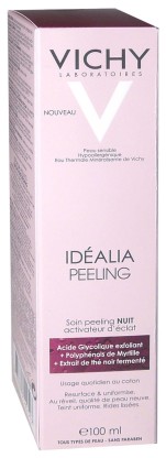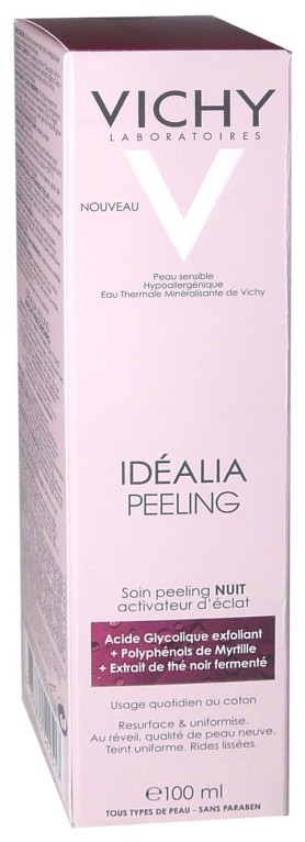 VICHY a conçu une gamme de soins formulés pour améliorer visiblement la qualité de la peau quel que soient l’âge, la carnation ou le type de peau : IDEALIA. Le Peeling nuit IDEALIA, à la texture gel très doux, enrichi en eau thermale de Vichy apaisante et fortifiante, est spécialement formulé pour agir pendant le sommeil et transformer visiblement la qualité de la peau. Sa composition contient des polyphénols de myrtilles aux propriétés antioxydantes et un extrait de thé noir fermenté, capable d’agir sur la qualité de la peau couche après couche afin de lisser la peau et atténuer signes de fatigue, rides et ridules, et redonner de l’éclat. L’acide glycolique qui est un acide de fruit aux propriétés exfoliantes agit efficacement en affinant le grain de peau tout en douceur pour un visage lisse au réveil. Il contient également de la glycérine et de l’adénosine aux propriétés hydratantes et énergisantes pour hydrater et tonifier la peau pendant 24 heures. Au réveil, la peau est lisse, lumineuse avec une sensation de fraîcheur, le teint retrouve son éclat, les signes de fatigue s’estompent. Formule hypoallergénique testée sous contrôle dermatologique, sans paraben.