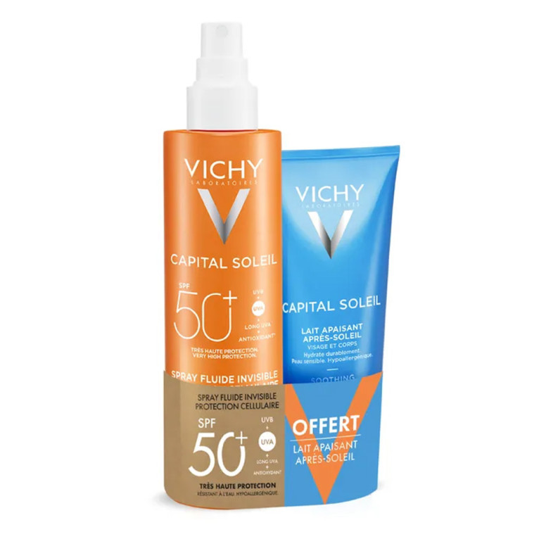 Découvrez le Vichy Capital Soleil Spray Fluide Invisible SPF50+ 200ml et son lait apaisant après soleil 100ml (offert) en vente en ligne sur le site de votre parapharmacie à prix discount. Protégez votre peau des rayons UV tout en la nourrissant en profondeur grâce à ce duo de produits de qualité. Visage et corps