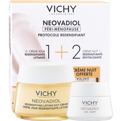 OFFRET Neovadiol Peri-ménopause Protocole redensifiant de Vichy discount, des soins expert pour revitaliser, redensifier et lifter la peau, dans votre parapharmacie en ligne à prix pas cher. Contient : Néovadiol PERI-MENOPAUSE Crème jour 50ml + Crème nuit redensifiante 15ml