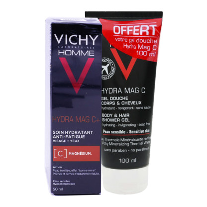 VICHY HOMME HYDRA MAG C+ SOIN HYDRATANT + GEL DOUCHE (offert) est un produit en vente en ligne sur le site de votre parapharmacie à prix discount.