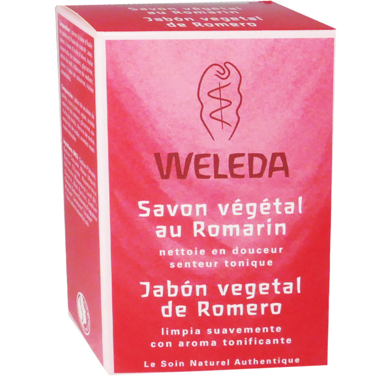 Weleda a choisi le meilleur de la nature et a conçu une gamme de savons végétaux à base d’huiles d’olives, de palme et de coco, enrichis en plantes adoucissantes, pour assurer une toilette tout en douceur et le respect de l’équilibre naturel de la peau. Le savon végétal au Romarin, qui développe une fine mousse au contact de l’eau, offre une composition idéale pour une toilette tonique grâce aux huiles essentielles de romarin aromatiques et vivifiantes.