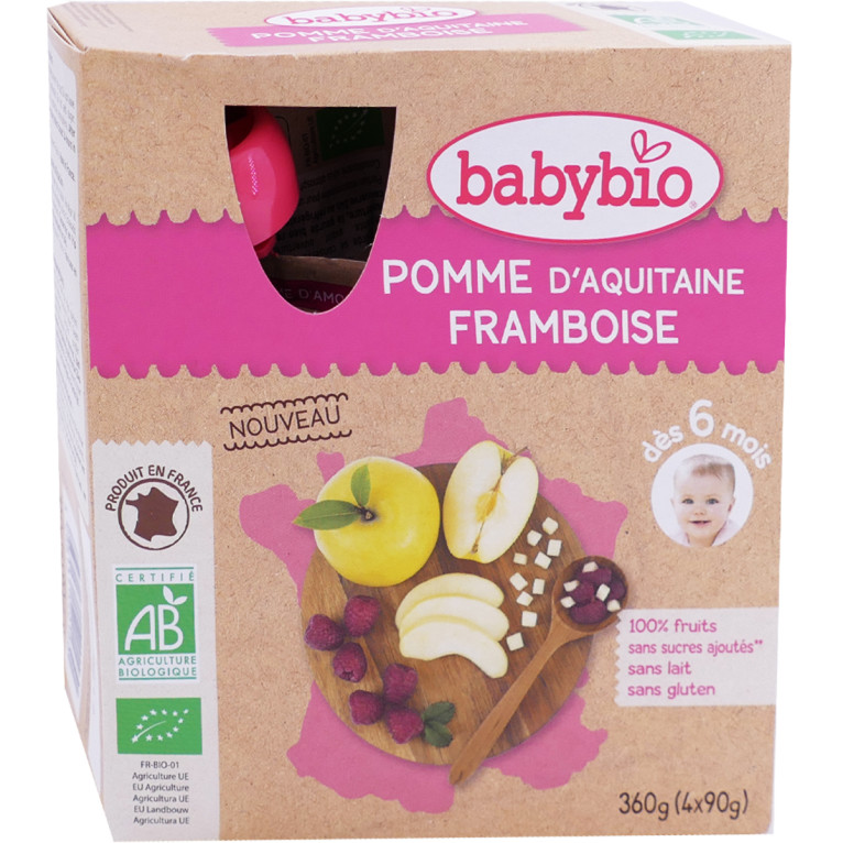 Les gourdes aux fruits de BABYBIO sont de délicieux desserts ou goûters pour les bébés dès 4 mois à base de savoureux fruits biologiques sans ajout de sucres. Dès 4 mois, la diversification alimentaire se fait tout en douceur en alternant avec les biberons de lait. Les Gourdes Pomme d’Aquitaine framboise au délicieux goût sucré de pomme d’Aquitaine, au petit goût acidulé de framboise d’Espagne, vont faire découvrir aux bébés à partir de 6 mois, de nouvelles saveurs pour une diversification alimentaire en douceur. Leurs purées 100% fruits adaptées raviront les papilles des bébés! Pratique en format gourde, ces délicieux goûters s’emporteront partout et sont adaptées aux mains des bébés. Sans sucres ajoutés, sans lait, sans gluten, sans épaississant