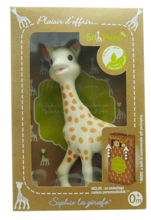 Depuis 1961, Sophie la girafe est devenue une figure emblématique du jouet made in France, plébiscitée par les mamans et leurs enfants ! 14 opérations manuelles sont indispensables pour transformer le caoutchouc issu de la sève d’Hevea 100 % naturelle en girafe Sophie et le secret de cette fabrication artisanale est jalousement gardé. L’inimitable Sophie est le jouet favori des bébés et de leur maman car elle permet l’éveil des sens du nourrisson et sa composition totalement naturelle assure une utilisation sans danger.