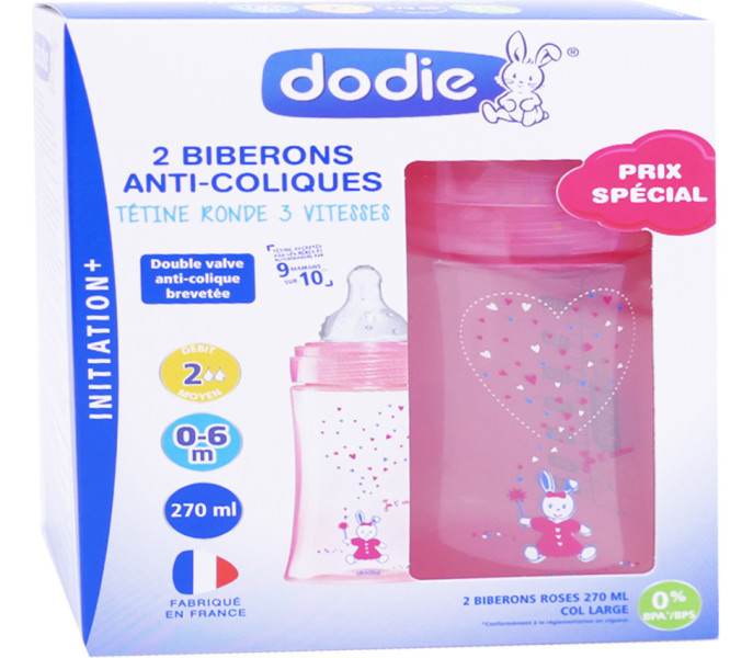 Les produits Dodie offrent aux bébés les meilleurs produits pour leur nutrition et leur confort et des produits aux mamans pour leur confort d'allaitement, de conservation et de stérilisation. Les biberons bénéficient d’une tétine en silicone ronde souple à 3 vitesses pour suivre le développement de bébé en adaptant le débit de lait en fonction de son âge, avec une base élargie pour le plus grand confort de bébé lors du repas. Sa technologie bénéficie d’une double valve intégrée à la tétine qui limite les coliques, les régurgitations et l’aérophagie en faisant circuler l’air régulièrement dans le biberon. Les biberons en forme triangulaire permettent une bonne prise en main pour le bébé et pour les parents et sa forme évasée leur permettent d’être bien stable. La bague de serrage permet de réguler l’air dans les biberons. Les graduations claires sont adaptées au dosage du lait. Leur col large permet de nettoyer et remplir le biberon facilement. Leur capuchon de forme ergonomique permet de l’enlever facilement d’une seule main et est antifuite. Les tout-petits passeront facilement du sein au biberon avec les biberons anti-coliques tétine ronde Initiation+.