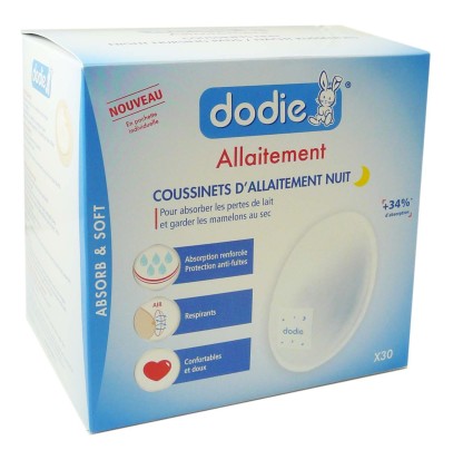Les coussinets Nuit de DODIE sont spécialement conçus pour offrir un très haut pouvoir absorbant (plus de 34% par rapport aux coussinets jours), tout en assurant confort et discrétion sous les vêtements de nuit et ne pas altérer le sommeil. Ces coussinets, très doux sont composés d’un tissu perméable à l'air pour laisser respirer la peau et imperméable au lait, doté de micro-perles ultra-absorbantes afin de prévenir efficacement l’écoulement de lait, maintenir la poitrine et les vêtements au sec, tout en restant bien en place grâce à leur double adhésif de maintien. Même humides, ils gardent leur forme, s’adaptent à toutes les tailles et formes de poitrine. Coussinets à usage unique et emballés individuellement.