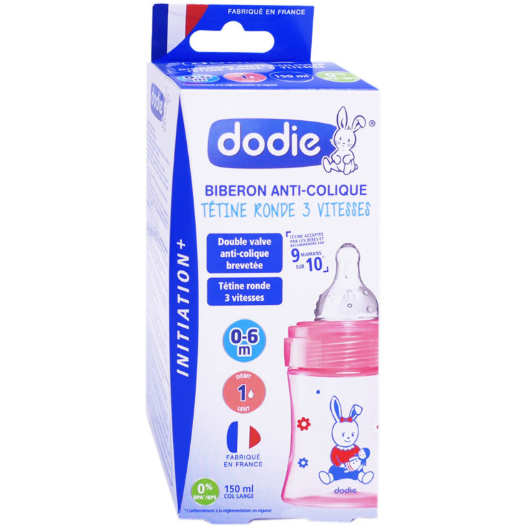 Les produits Dodie offrent aux bébés les meilleurs produits pour leur nutrition et leur confort et des produits aux mamans pour leur confort d'allaitement, de conservation et de stérilisation. La tétine en silicone extra-souple débit 1 avec une base élargie pour le plus grand confort de bébé lors du repas ressemblant à l’allaitement au sein. Son système de double valve anti-colique breveté limite les coliques, les régurgitations et l’aérophagie en faisant circuler l’air régulièrement dans le biberon. Le biberon en forme triangulaire permet une bonne prise en main pour le bébé et pour les parents et sa forme évasée lui permet d’être bien stable. La bague de serrage permet de réguler l’air dans le biberon. Les graduations claires sont adaptées au dosage du lait. Le col large permet de nettoyer et remplir le biberon facilement. Le capuchon de forme ergonomique permet de l’enlever facilement d’une seule main et est antifuite. Les tout-petits passeront facilement du sein au biberon tout en retrouvant les sensations de la douceur de la maman.
