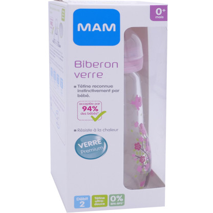 MAM développe depuis 35 ans des produits de puériculture uniques, tant par leur design que par leur fonctionnalité, afin de favoriser le développement des jeunes enfants et répondre aux exigences de leur parents. Chaque produit est conçu en partenariat avec des professionnels du monde médical, pédiatrique et scientifique : médecins, sages-femmes, psychologues du développement, designers et experts en technologie, afin que tous les bébés démarrent la vie du bon pied. Le biberon verre 0M+ MAM, en verre résistant de qualité Prémium, qui offre une bonne prise en main, est ultra fonctionnel avec ses larges ouvertures qui permettent un dosage facile du lait et un nettoyage efficace. En verre solide, le biberon peut être chauffé ou refroidi rapidement, nettoyé au lave-vaisselle ou stérilisé à haute température. Sa tétine SkinSoft débit 2 est formulée à base de silicone doux comme la soie, sa forme légèrement aplatie rappelle instinctivement le sein, facilitant ainsi la prise de la tétine par Bébé. Les graduations visibles permettent un dosage précis. Ce biberon possède également un bouchon antifuite qui protège des salissures et peut servir de doseur. Biberon accepté par 94% des bébés.