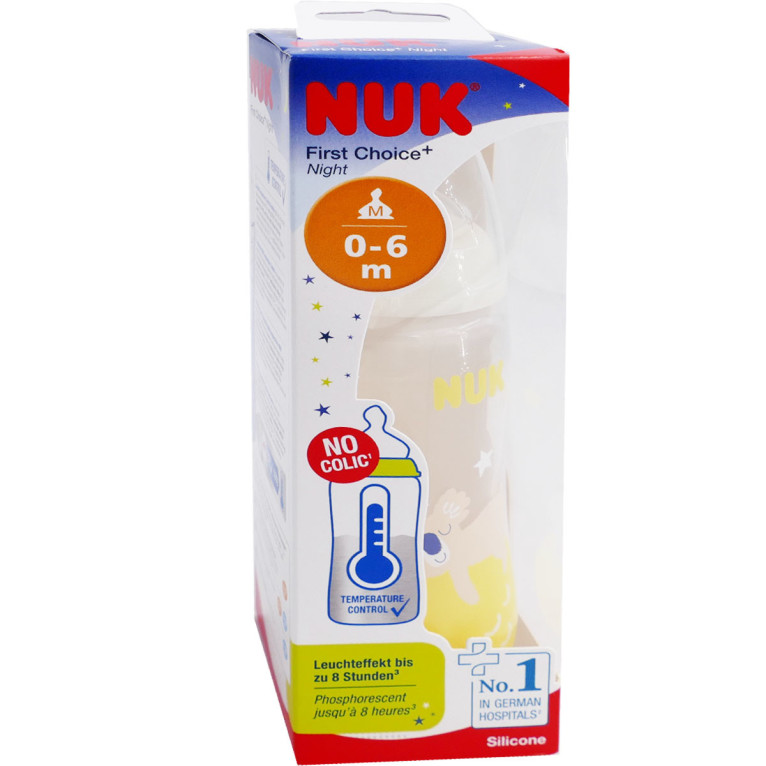 Les biberons NUK répondent de la meilleure façon aux besoins des bébés, ils accompagnent harmonieusement leur développement pour une transition du sein au biberon en douceur. Ils sont dotés d’une tétine physiologique en silicone souple avec perforation fine (débit 1) et M (Thé et Lait infantile) ayant la forme d’un mamelon, conçue avec le système Air System® anti-colique, anti-régurgitation et anti-aérophagie. Ces biberons assurent une bonne prise en main par leur forme légèrement incurvée. Le col large facilite le remplissage et l’entretien. La base large permet une stabilité du biberon optimale. Innovant, ce biberon permet grâce à un thermomètre situé à sa surface, de contrôler la température de l’alimentation de bébé afin qu’il évite de se brûler. Lorsque la couleur du thermomètre bleu devient blanc, la nourriture est trop chaude. Le nouveau biberon First Choice+ Night se trouve facilement dans le noir et permet de nourrir bébé sans allumer la lumière de la pièce grâce à l’anneau qui brille. Sans Bisphénol A.