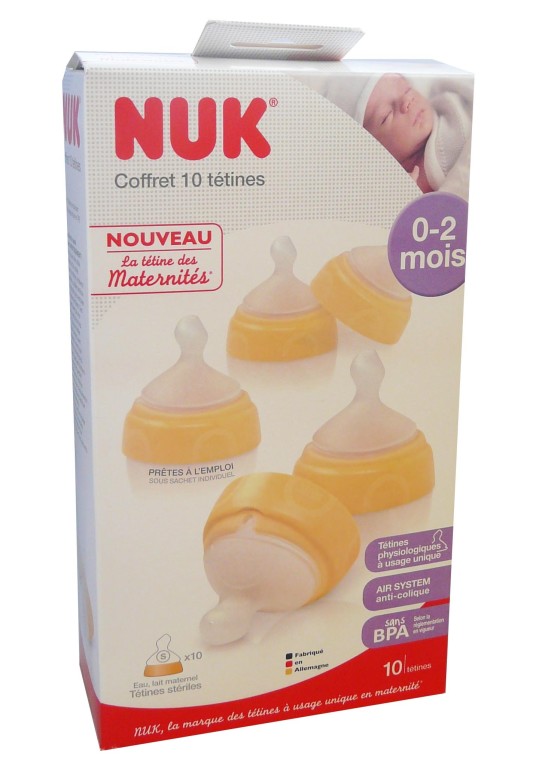 Les produits NUK offrent aux bébés les meilleurs produits pour leur nutrition et leur confort et des produits aux mamans pour leur confort d'allaitement, de conservation et de stérilisation. Les tétines physiologiques emballées individuellement à usage unique, en silicone débit S, ont la même forme que le sein de la maman avec une base élargie pour le plus grand confort de bébé lors du repas et un bon développement de la bouche. Leur système Air System® limite les coliques, les régurgitations et l’aérophagie en faisant circuler l’air régulièrement dans le biberon et sont dotés d’un seul trou percé sur le dessus pour un positionnement au niveau du palais. Plus larges que les autres tétines, les tétines NUK asymétriques permettent à la mâchoire inférieure d’avancer pour une meilleure position dans la bouche.