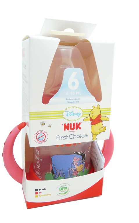Le biberon tasse incassable First Choice 150 ml 6-18 mois de NUK, le meilleur dès les premières heures de la vie dans un biberon à l’effigie des personnages Disney pour apprendre à boire tout seul.