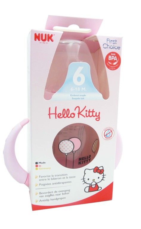 Le biberon tasse incassable First Choice 150 ml 6-18 mois de NUK, le meilleur dès les premières heures de la vie dans un biberon à l’effigie de « Hello Kitty » pour apprendre à boire tout seul.