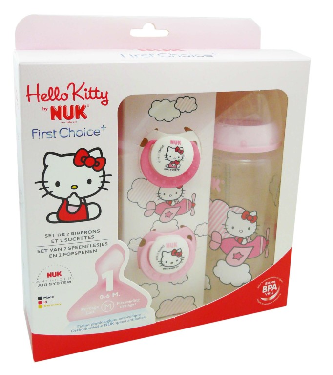 NUK, le meilleur dès les premières heures de la vie dans un coffret de 2 biberons de 300 ml et 2 sucettes à l’effigie de «Hello Kitty », de 0 à 6 mois.