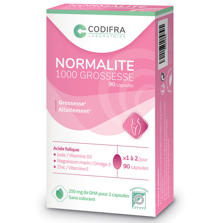 Normalite Grossesse 1000 du laboratoire CODIFRA, est un complément alimentaire composé de vitamine B12, qui participe à la formation normale de globules rouges, et de vitamine B9, qui contribue à la croissance des tissus maternels pendant la grossesse. Du DHA ( un acide provenant d’oméga 3), vient s’ajouter à ce produit et aide au développement normal du cerveau et des yeux du fœtus.