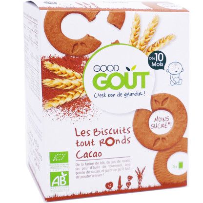 Découvrez la nouvelle marque française d’alimentation biologique sans produits chimiques ni pesticides ni OGM, à base de fruits et de légumes savoureux : GOOD GOUT. Spécialisée dans la conception de produits délicieux, GOOD GOUT vous assure qualité nutritionnelle, saveurs naturelles et plaisirs gustatifs pour régaler les enfants dès le plus jeune âge ! Lorsque vient l’âge de la diversité alimentaire, Bébé est avide de nouvelles saveurs et de textures différentes. Les Biscuits Ronds 30% moins sucré que d’autres biscuits, au cacao bio régaleront les papilles des plus jeunes ! En forme d’anneau pour que bébé les attrapent bien, les biscuits s’emportent partout avec soi grâce à leur sachet individuel pour répondre aux envies gourmandes des petits ! 30% moins sucré