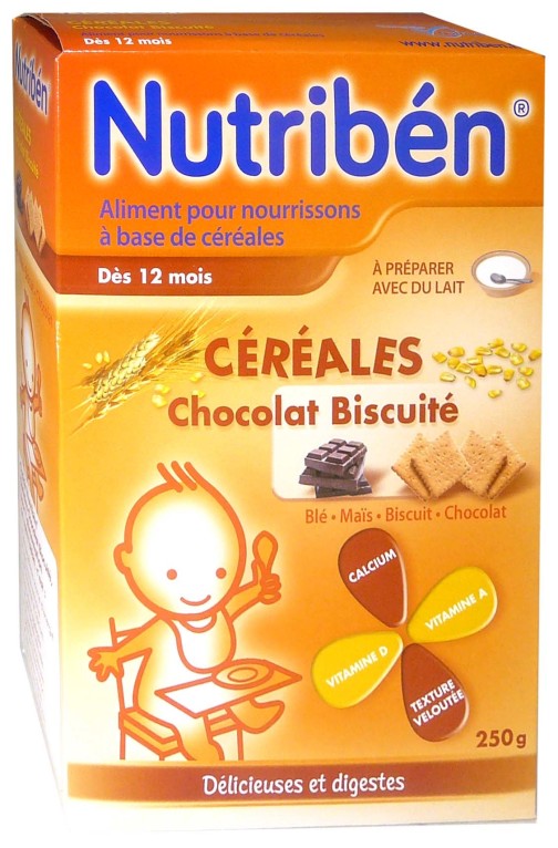 Les céréales chocolat biscuité de NUTRIBEN, les céréales qui vont faire connaître aux enfants de nouvelles saveurs par la farine au bon goût de chocolat et de biscuits aux petits-déjeuners ou au goûters. A partir de 12 mois.